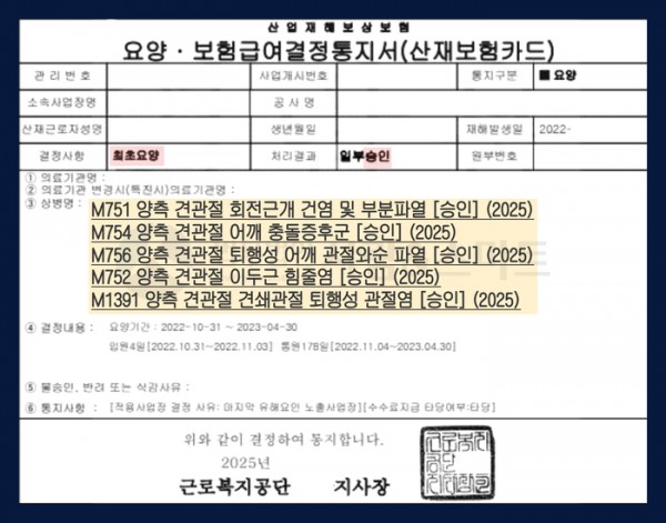 그에 따라 근로복지공단은 양측 견관절 부위의 '회전근개 건염 및 부분 파열, 어깨 충돌증후군, 퇴행성 어깨 관절와순 파열, 이두근 힘줄염, 견쇄관절 퇴행성 관절염'에 대한 요양 승인 결정을 내렸습니다.