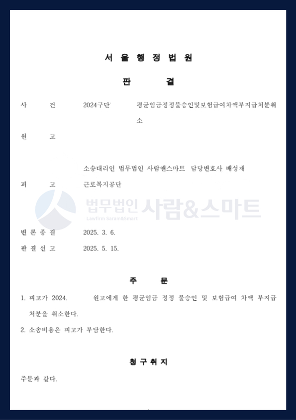 이에 의뢰인은 불복하여 산재 특화 법무법인 사람앤스마트와 함께 [평균임금정정 불승인 및 보험급여차액 부지급 처분 취소 소송]을 제기하게 되었습니다.
