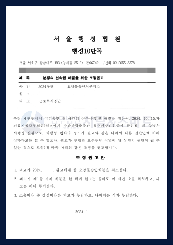 그 결과, 법원은 승소에 준하는 요양 불승인 처분 [취소] 조정권고안을 제시하였습니다.
