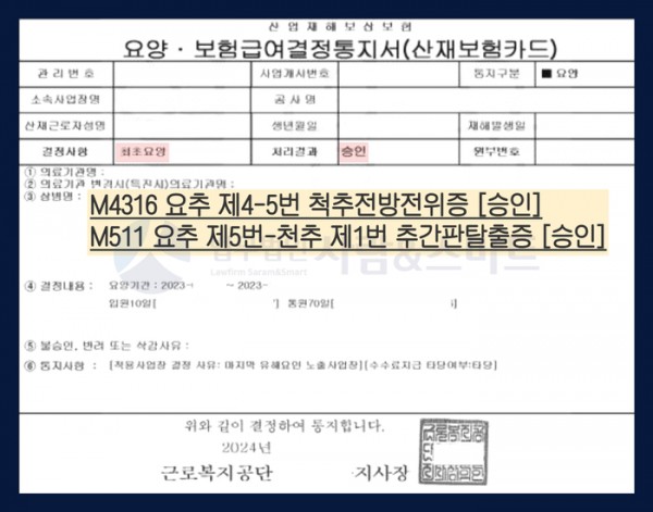 그에 따라 근로복지공단은 '요추 제4-5번 척추전방전위증, 요추 제5번-천추 제1번 추간판탈출증'에 대한 요양 승인 결정을 내렸습니다.