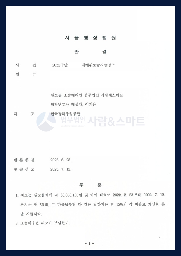 그 결과, 법원에서는 법무법인 사람앤스마트의 주장을 받아들여, 이미 지급된 제3급 재해위로금을 공제한 재해위로금 총 약 1억 1천만원 [지급] 판결을 내렸습니다.