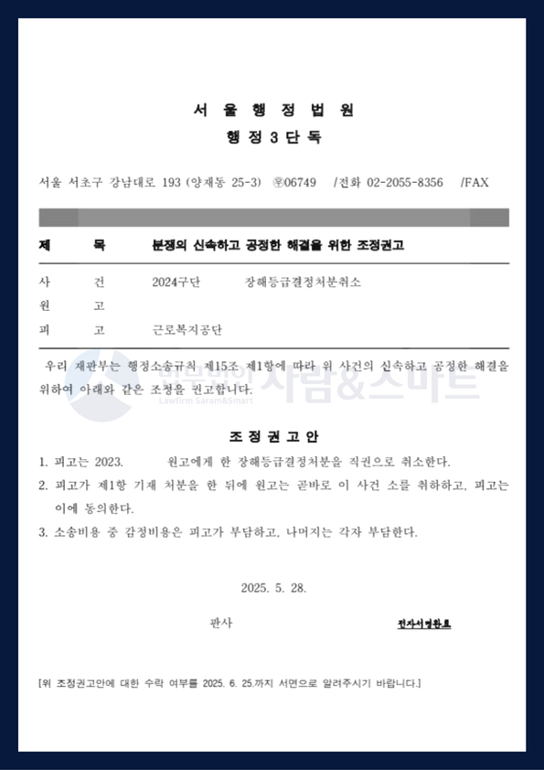 그 결과, 법원은 법무법인 사람앤스마트의 주장을 받아들여 공단의 장해 3급 처분이 부당하다는 취지의 장해등급결정처분 [취소] 조정권고안을 제시하였습니다.