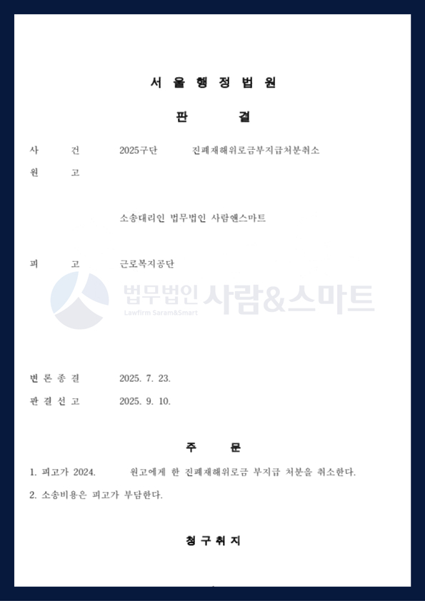 이에 의뢰인은 불복하여 산재 특화 법무법인 사람앤스마트에 사건을 의뢰하셨고, 함께 [진폐재해위로금 부지급 처분 취소 소송]을 제기하게 되었습니다.